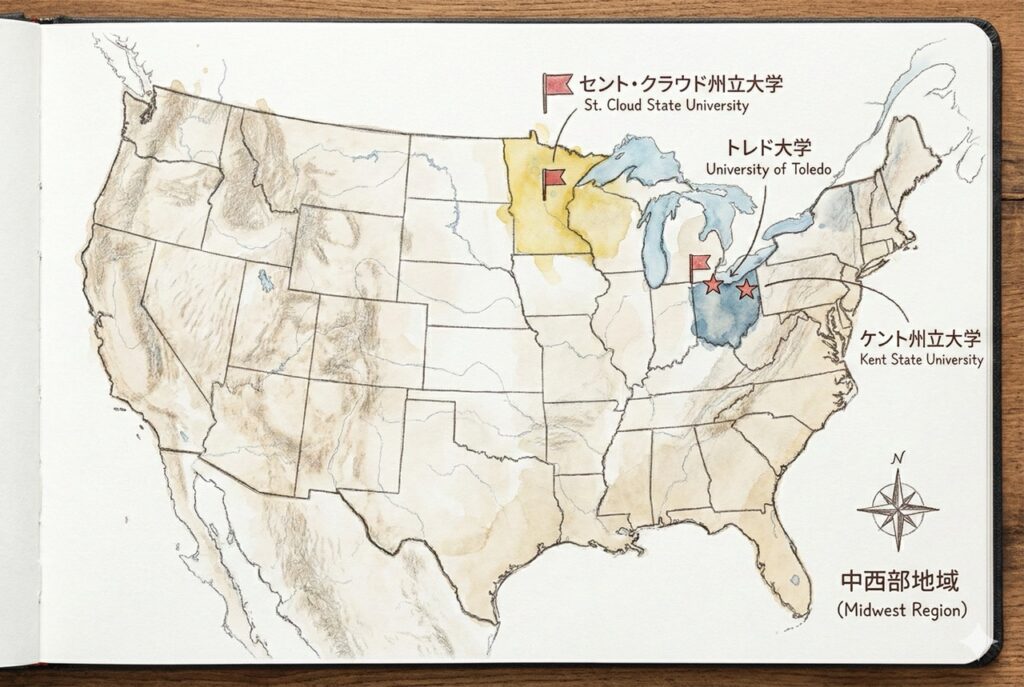 候補としては5校ほど書けたそうで、セント・クラウド州立大学やトレド大学なども挙げていました。「なんかわかんないですけど北の方に行きたくて」と笑います。幸い第一志望のケント州立大学に決まりました。