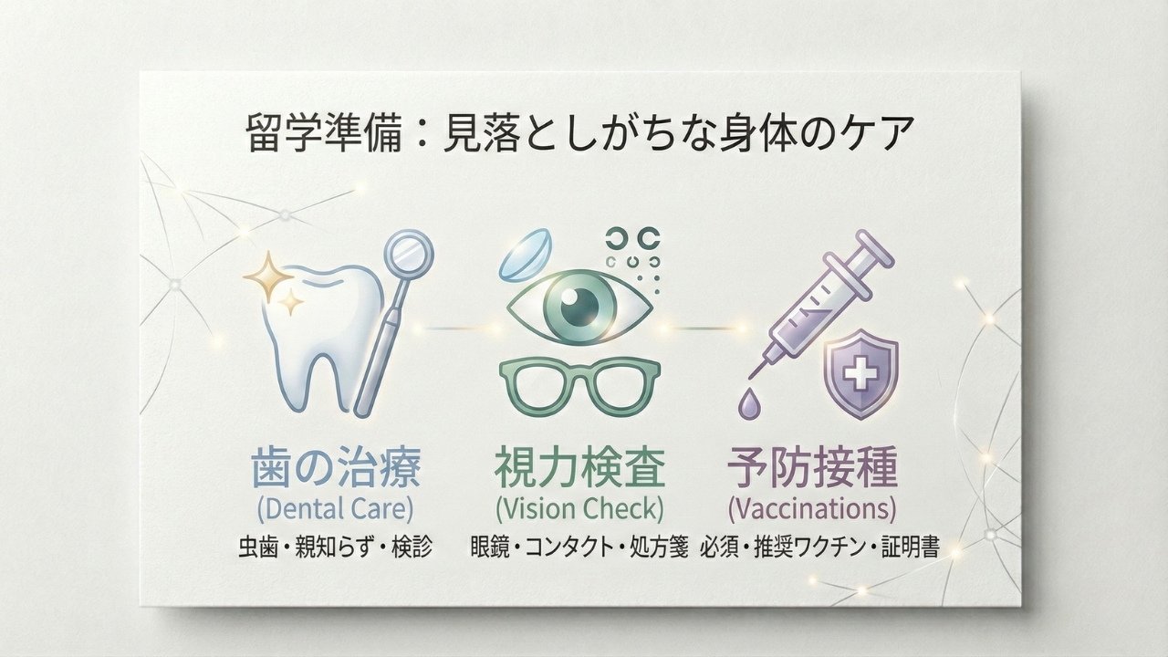 海外大学への進学準備といえば、出願書類、ビザ、お金の管理など、やることがたくさんあります。でも、意外と見落としがちなのが、歯、視力、ワクチンなどの「体のメンテナンス」です。
