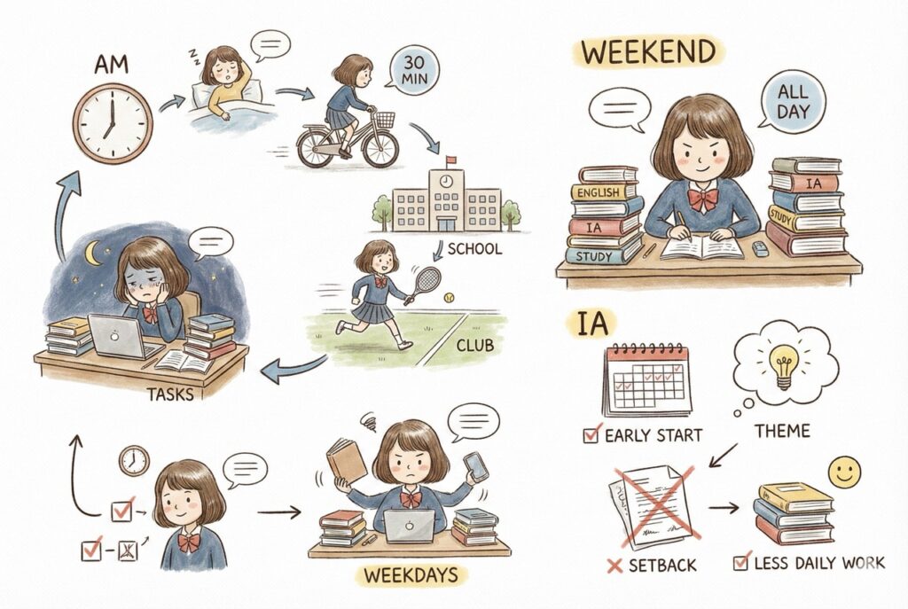 高校3年生の春は、部活、IA(Internal Assessment:内部評価)、英語の勉強を同時に進めていました。